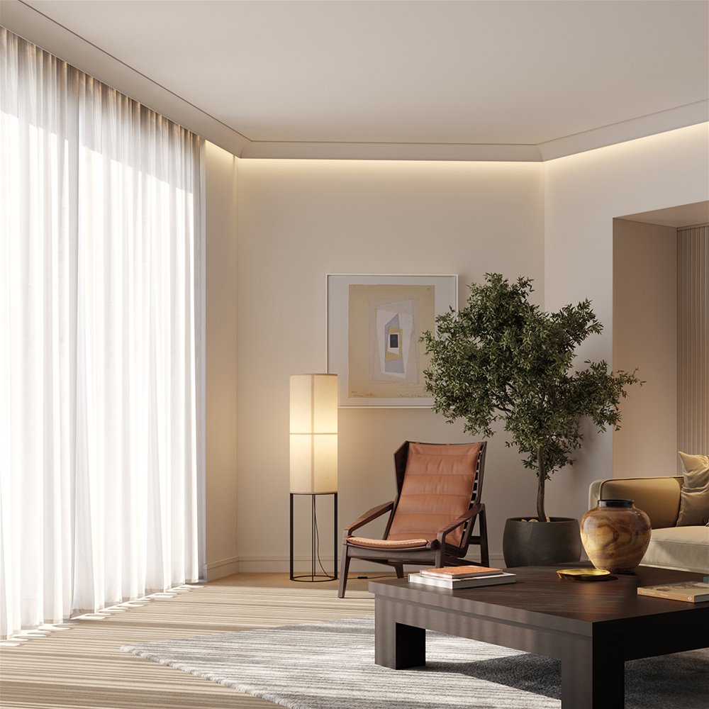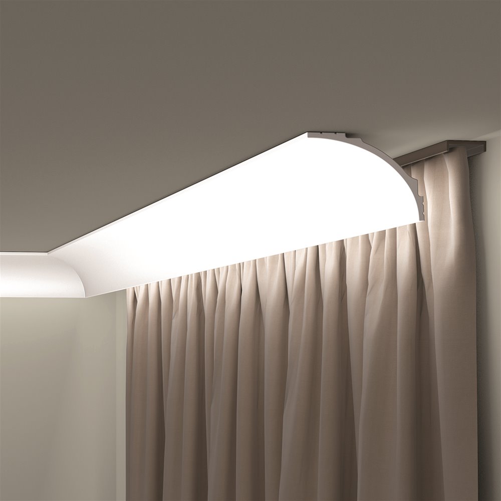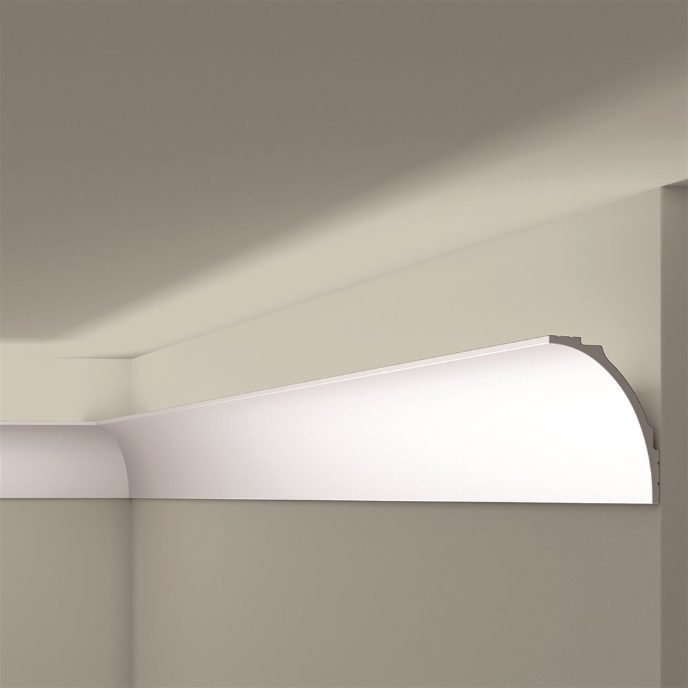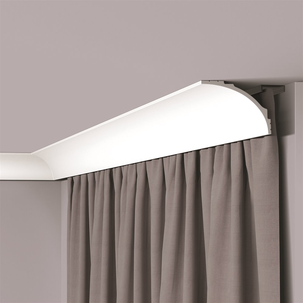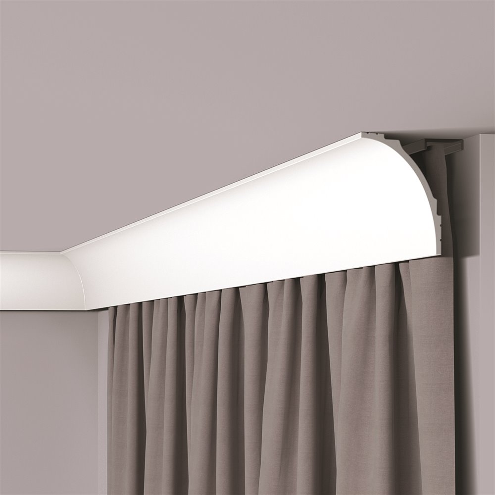 IL18 lijst - 12,1 x 9 cm - per lengte van 2 meter. Het IL18 WALLSTYL® gordijnprofiel, dat een brug vormt tussen onze collecties indirecte verlichting en plafondlijsten, heeft een tijdloze aantrekkingskracht, met een elegante welving en strakke lijnen voor een onberispelijke afwerking. In combinatie met LED-verlichting creëert het een gezellige, warme sfeer, terwijl het interieurs een onmiskenbaar moderne uitstraling geeft. De IL18 WALLSTYL®, gemaakt van polystyreen met hoge dichtheid, is ontwikkeld met een minimalistische inslag en verbergt op een slimme manier de gordijnrails, voor een naadloos eigentijds ontwerp.